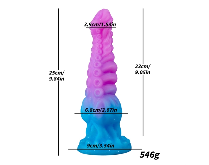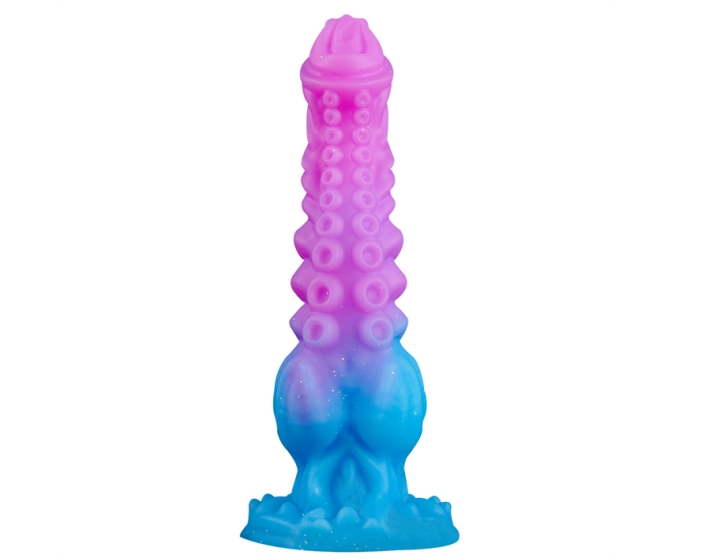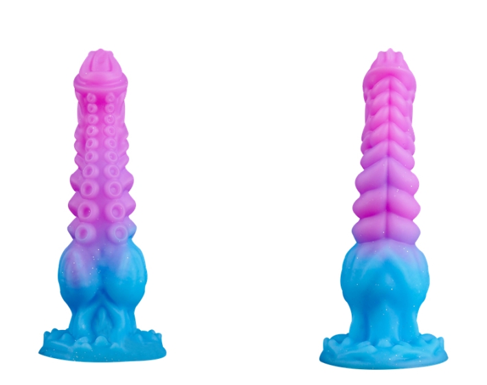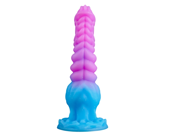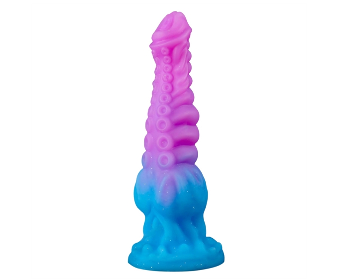 Glittery Fantasy Theme: Escape reality with this alien-inspired dildo. The glittery pink and blue colors make it a beautiful addition to any collection and a great gift for fantasy lovers.